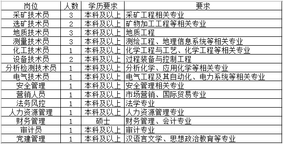專業(yè)技術(shù)管理人才結(jié)構(gòu):采礦、礦物加工、資源勘查、測(cè)量、機(jī)械工程及其自動(dòng)化、過(guò)程裝備與控制、電氣、儀表、自動(dòng)化、企業(yè)管理、會(huì)計(jì)或財(cái)務(wù)管理、市場(chǎng)營(yíng)銷、法律……等。