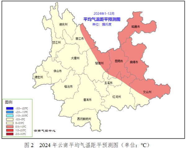 全省大部地區(qū)降水接近常年同期到偏少,氣溫接近常年同期到偏高。據(jù)氣象部門預(yù)測(cè),降水:迪慶州西北部、怒江州北部、昭通市東北部、曲靖市東北部邊緣地區(qū)偏多10%—20%,其余大部地區(qū)接近常年同期到偏少,其中西雙版納州、普洱市中西部、臨滄市中南部、保山市南部、德宏州中南部偏少10%—20%(見圖1)。氣溫:全省大部地區(qū)接近常年同期到偏高,其中文山州中北部、曲靖市、昭通市、昆明市、楚雄州東北部、麗江市東部偏高0.5~1.0℃(見圖2)。重點(diǎn)關(guān)注:冬春季階段性強(qiáng)冷空氣引發(fā)的低溫冰凍雨雪天氣;2月下旬至4月上旬滇東北、滇西北及高海拔地區(qū)倒春寒天氣;春季冰雹大風(fēng)等強(qiáng)對(duì)流天氣;春末夏初氣象干旱;主汛期強(qiáng)降水引發(fā)的洪澇和地質(zhì)災(zāi)害,區(qū)域性氣象干旱。