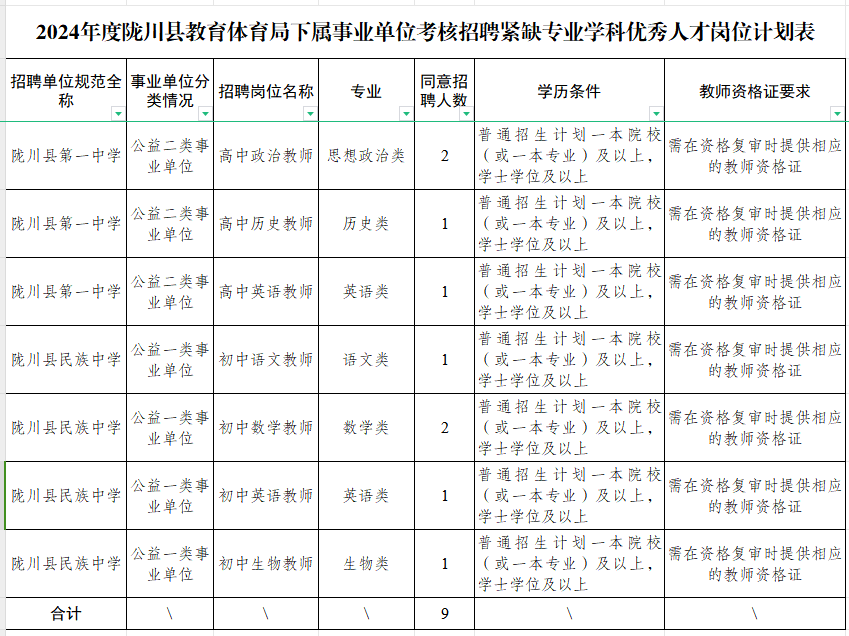 根據(jù)《關(guān)于同意縣教育體育局黨組使用編制通知單》(隴機(jī)編辦準(zhǔn)[2023]4號)及《隴川縣人力資源和社會保障局關(guān)于印發(fā)2024年教育衛(wèi)生部門考核招聘緊缺專業(yè)學(xué)科優(yōu)秀人才工作方案的通知》隴人社發(fā)〔2024〕2號文件精神,2024年隴川縣教體系統(tǒng)考核招聘緊缺專業(yè)學(xué)科優(yōu)秀人才9名,其中:隴川縣第一中學(xué)4名、隴川縣民族中學(xué)5名。現(xiàn)將有關(guān)事宜公告如下: