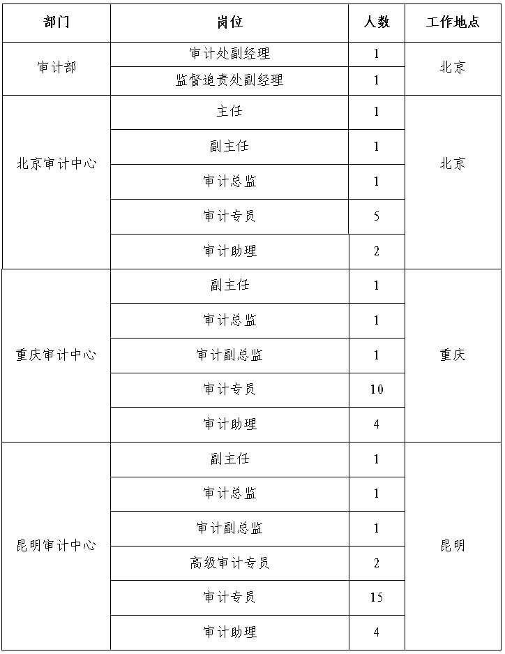 根據(jù)工作需要,經(jīng)研究決定,現(xiàn)面向社會公開招聘方式補(bǔ)充集團(tuán)總部、有關(guān)單位審計人員65人,F(xiàn)將有關(guān)事項公告如下: