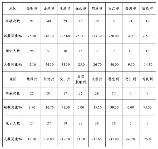 較大事故:昆明市1起、死亡3人,同比持平;昭通市2起、死亡6人,同比凈增加2起、6人;西雙版納州2起、死亡6人,同比凈增加2起、6人;大理州1起、同比減少1起,死亡8人、同比增加1人。