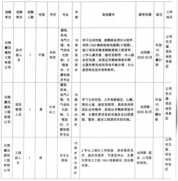 云南豪迅建筑工程有限公司因工作需要,委托澄江市啟澄人力資源有限責(zé)任公司,面向社會(huì)公開(kāi)招聘技術(shù)工作人員3名,現(xiàn)將有關(guān)事項(xiàng)公告如下: