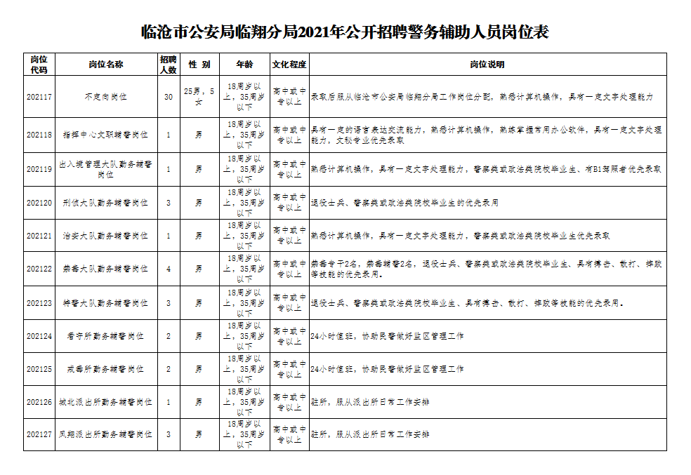 附:臨滄市公安局臨翔分局2021年公開招聘警務輔助人員崗位表