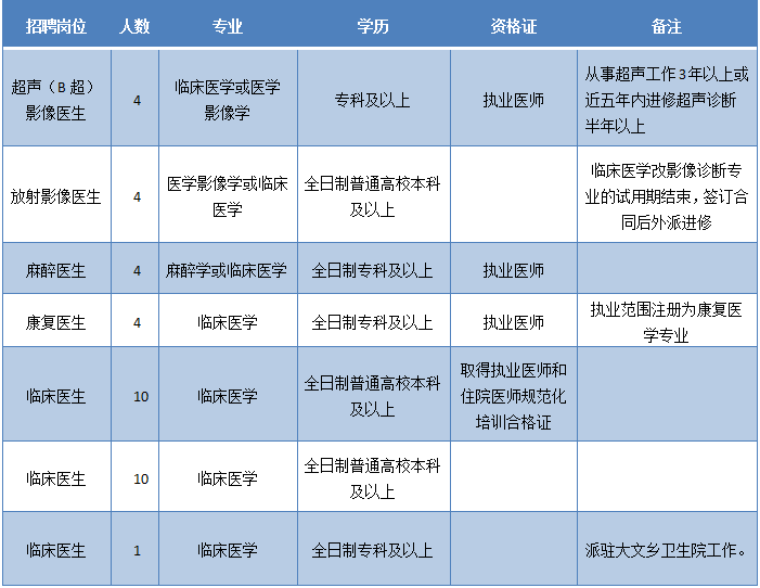 1.超聲醫(yī)生、麻醉醫(yī)生、康復(fù)醫(yī)生,工資標準和職稱晉升享受編內(nèi)職工同類同級人員待遇,且一次性給予補助安家費:初級職稱10萬元、中級職稱20萬元,副高職稱以上人員可以參照縣內(nèi)高層次人才引進同等待遇。