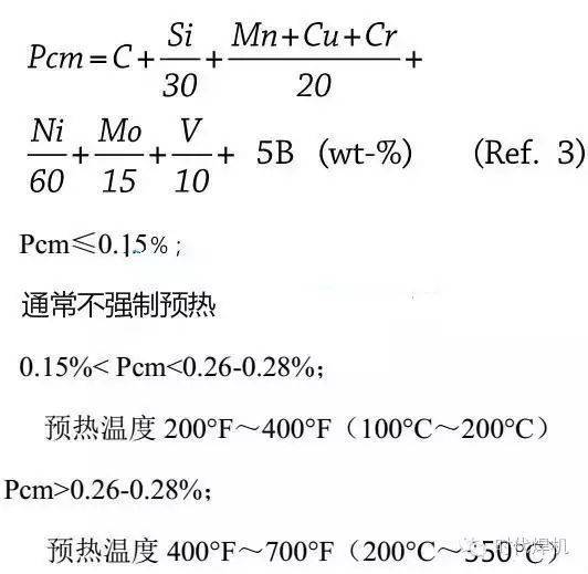 當(dāng)碳含量≤0.17(重量百分比),或涉及到高強(qiáng)鋼時(shí),可以使用Ito & Bessyo裂紋量度參數(shù) (Pcm)。對(duì)于何時(shí)需要預(yù)熱,何時(shí)要強(qiáng)制預(yù)熱,以及推薦什么預(yù)熱溫度,這種方法提供了更加準(zhǔn)確的評(píng)估。公式如下: