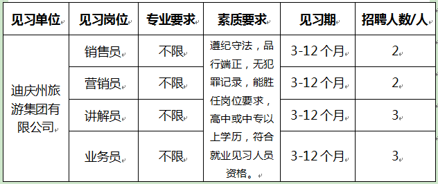 迪慶州旅游集團設置就業(yè)見習崗位10個,擬招聘青年就業(yè)見習人員10人(詳見下表)。